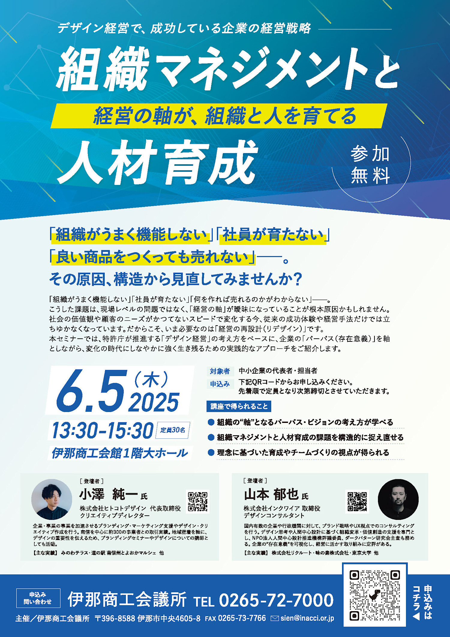 2025年6月5日(木)に開催された「組織マネジメントと人材育成」セミナーに、弊社取締役の山本が登壇しました。 このセミナーは、長野県伊那市の伊那商工会議所によって開催されました。